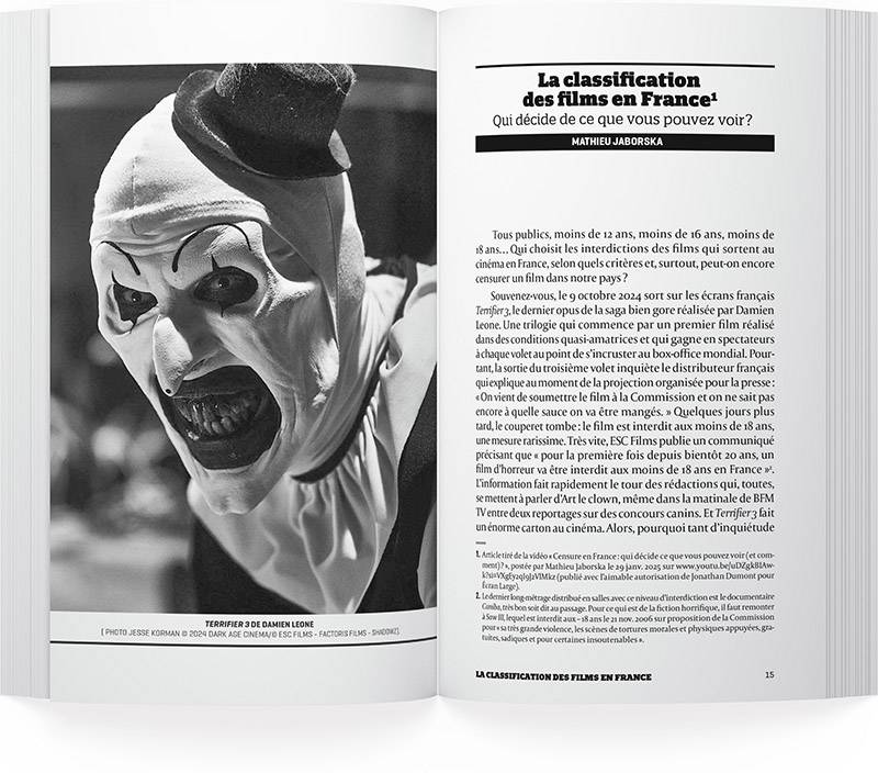 Ce volume a pour ambition de vous faire découvrir le ton et l’esprit de la collection à travers une sélection d’articles tirés des précédents volumes, avec un inédit dans lequel Mathieu Jaborska revient sur le dispositif de classification des œuvres cinématographiques en France après l’interdiction aux –18 ans du film Terrifier 3.
