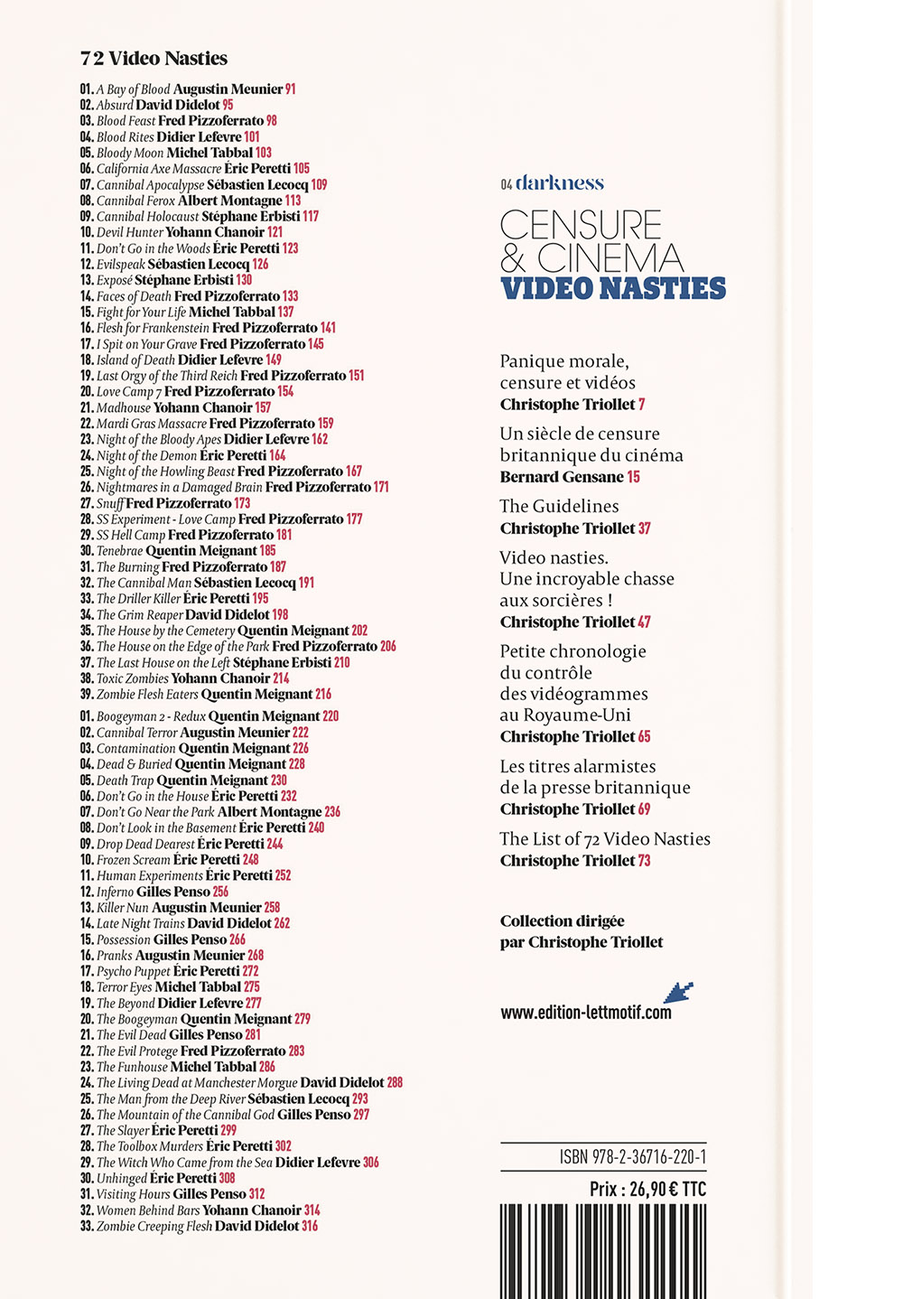 Au milieu des années 1970, l’apparition des magnétoscopes change radicalement la manière de consommer le cinéma, les spectateurs pouvant désormais louer sans aucun contrôle préalable des films que les salles ne projettent pas. Les éditeurs de cassettes vidéo remplissent alors les catalogues d’œuvres souvent inédites, parfois pornographiques, violentes ou interdites qui échappent à tout contrôle pour le plus grand plaisir des amateurs de Bis. Au Royaume-Uni, les pouvoirs publics sont alertés par certaines associations familiales qui ne comprennent pas que des enfants puissent voir librement des films honteux et dégradants. Pour contrer la diffusion d’œuvres jugées particulièrement dangereuses pour la jeunesse, la police anglaise organise et multiplie des saisies médiatisées dans les vidéoclubs en vertu de la loi de 1959 réprimant l’obscénité. À la demande de la principale association des vendeurs et loueurs de vidéos de Grande-Bretagne qui souhaite éviter que ses membres ne fassent l’objet de poursuites judiciaires, les autorités finissent par publier en 1983 une liste infamante de 72 titres stigmatisés sous la dénomination de Video Nasties. […] (Christophe Triollet)