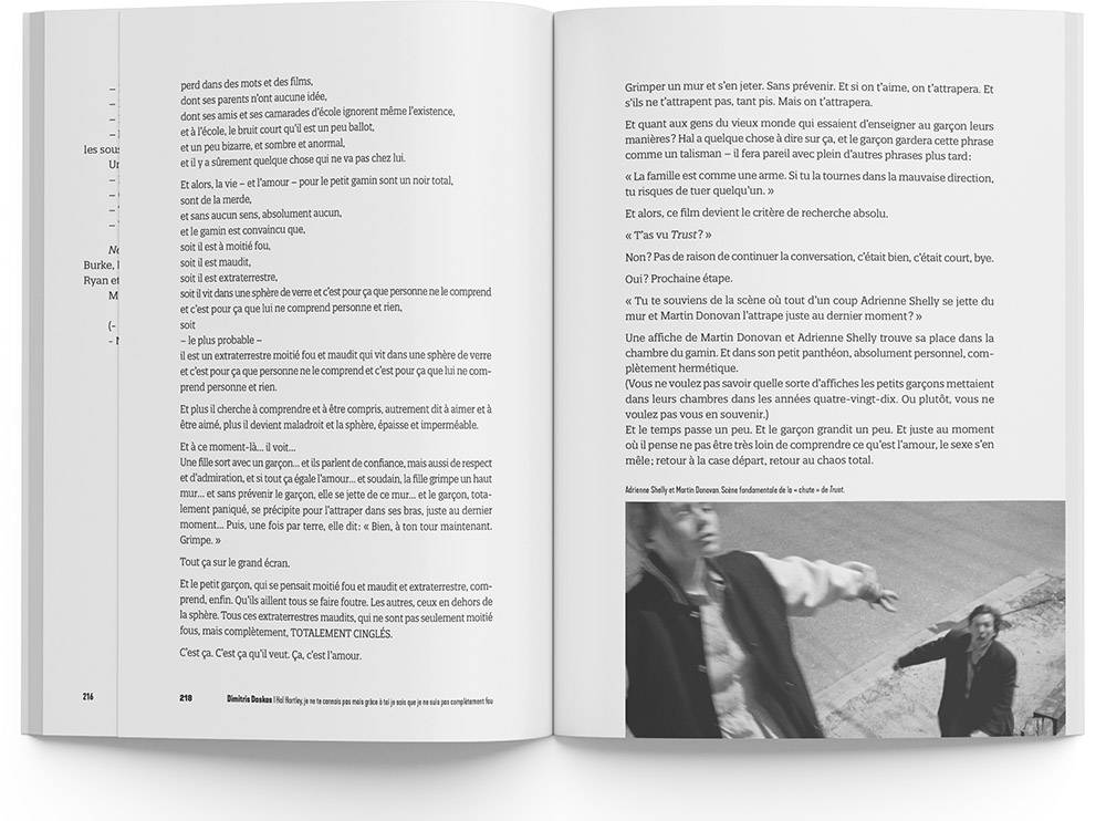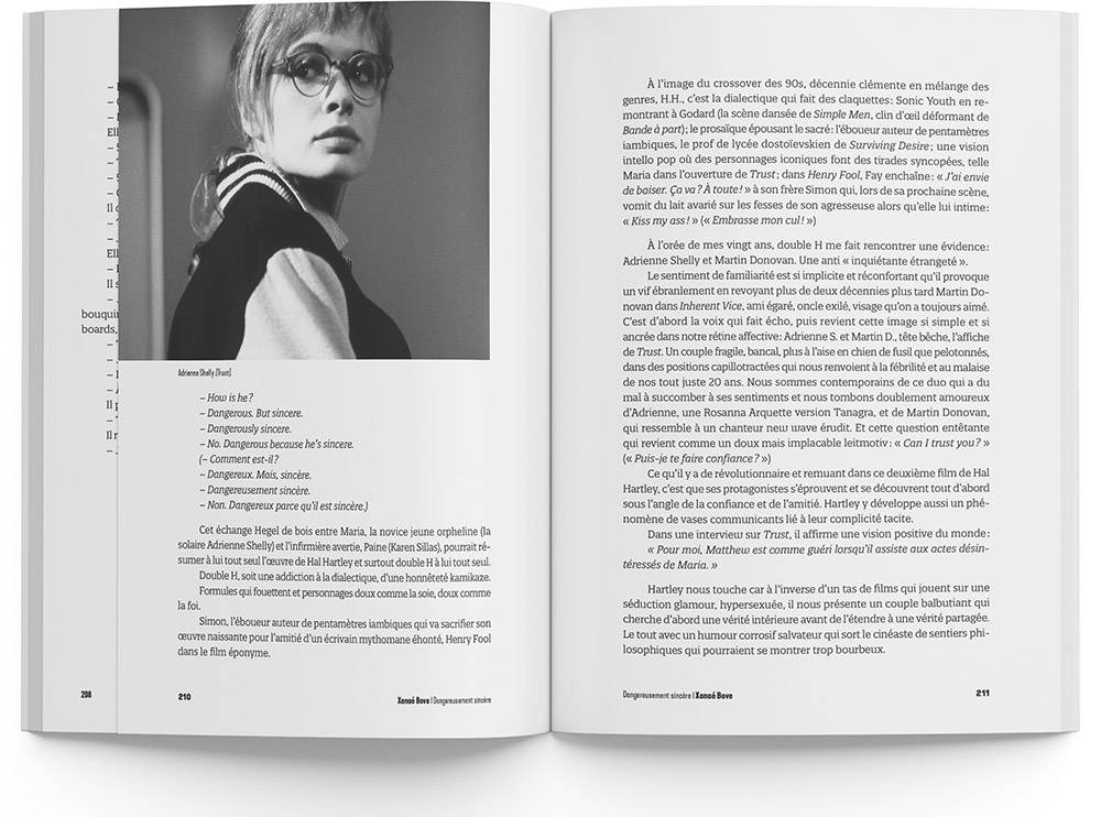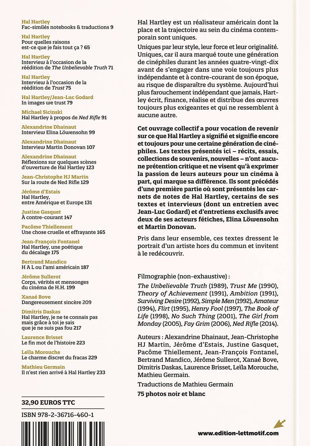 Cet ouvrage collectif a pour vocation de revenir sur ce que Hal Hartley a signifié et signifie encore et toujours pour une certaine génération de cinéphiles. Les textes présentés ici – récits, essais, collections de souvenirs et même poèmes – n’ont aucune prétention critique et ne visent qu’à exprimer la passion de leurs auteurs pour un cinéma à part, qui marque sa différence. Ils sont précédés d’une première partie où sont présentés les carnets de notes de Hal Hartley, certains de ses textes et interviews (dont un entretien avec Jean-Luc Godard) et d’entretiens exclusifs avec deux de ses acteurs fétiches, Elina Löwensohn et Martin Donovan.